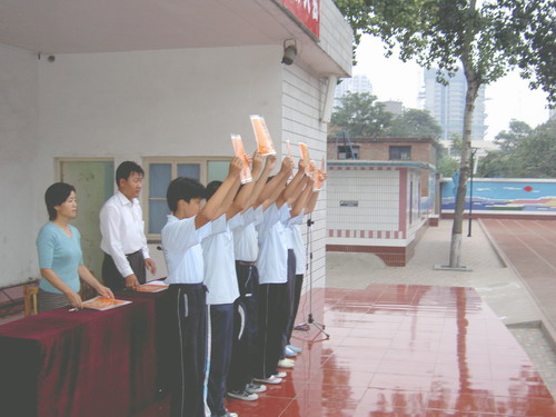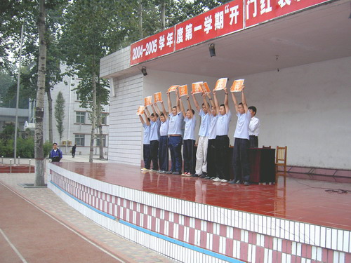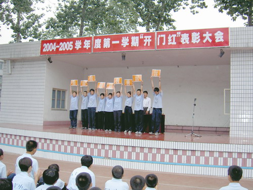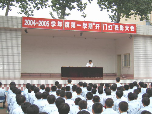 9月24日下午,在我校大操场召开了2004--2005学年度第一学期 "开门红"表彰大会。会上,首先由各年级学生代表:初一3班高洁、初二1班任洁、初三10班董梦璇分别就军训、青年志愿者活动做典型发言。接着教育处赵主任就"开门红"评比活动做了大会总结。总结中对我校学生在遵规守纪、文明礼貌方面给于肯定,也对在军训、素质教育基地、志愿者活动中和关心班集体以及做好人好事的优秀典型进行了大力表彰。同时也对发现的问题如小车接送、辱骂他人、不正常接触给予严肃的批评,在提出明确要求的基础上又寄予殷切的希望。最后,在欢快的颁奖曲中,教育副校长莫中勤和教育处赵主任为获奖班级颁发了奖状。
