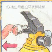 ★“121l”灭火器:使用“1211”灭火器时,首先撕下铅封、拔掉保险销,然后在距火源1.5~3米处,将喷嘴对准火焰的根部,用力按下压把,压杆就将密封开启,“1211"灭火剂就在氮气压力作用下喷出,松开压把,喷射中止。如遇零星小火,可采取点射方法灭火。